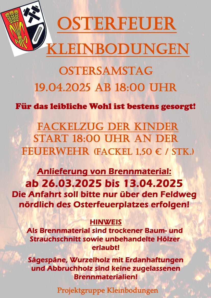 Unter der Leitung der Projektgruppe Kleinbodungen wird auch in diesem Jahr wieder zum traditionellen Osterfeuer eingeladen!